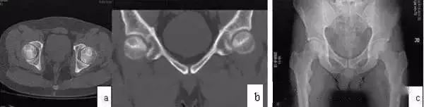 图2 CT显示坏死灶明显,硬化带形成(a,b);X线片坏死灶显示不清(c)
