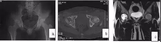 图10 男,28岁,右髋钝痛二年,关节活动明显受限,诊断为色素沉着绒毛结节滑膜炎。(a)MRI的T1WI示右股骨头、颈弥散性低信号;(b)X线片示右髋股骨头及髋臼破坏,关节间隙变窄;(c)CT扫描示股骨头颈骨破坏