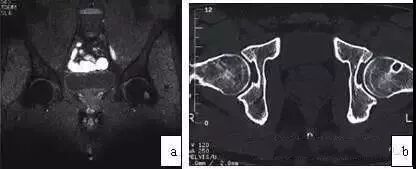 图3 男,35岁,髋臼股骨撞击症,左股骨头颈交界处滑膜疝凹。(a)T2WI抑脂像示圆形高信号;(b)CT扫描示左髋头颈交界区囊形变