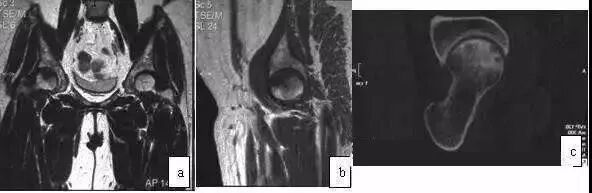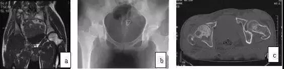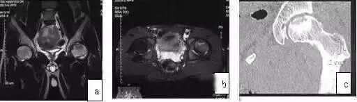 图8 男,21岁,右髋关节疼痛伴膝关节疼痛,关节活动轻度受限,手术诊断为软骨母细胞瘤。(a)X线片病灶显示不清;(b)CT扫描示股骨头内不规则破坏,边界清楚;(c)MRI T2WI示股骨头内片状高信号