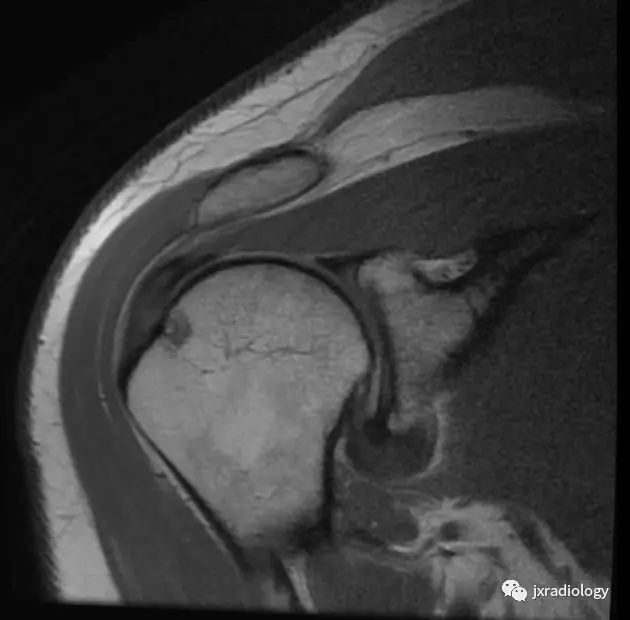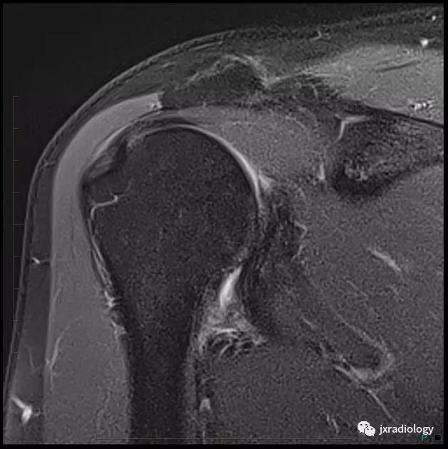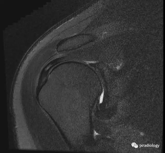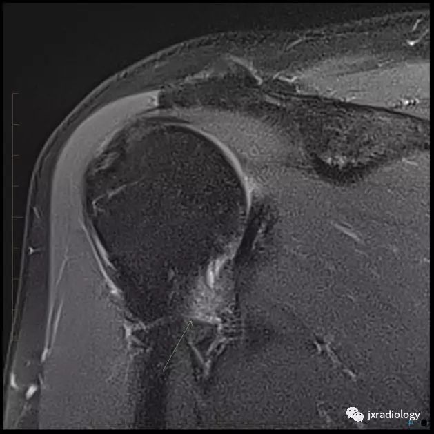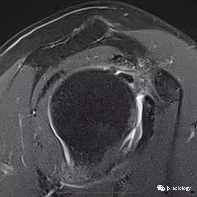 腋囊增厚纤维化(T1/T2均为低信号):