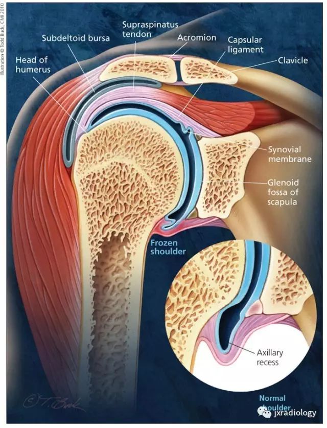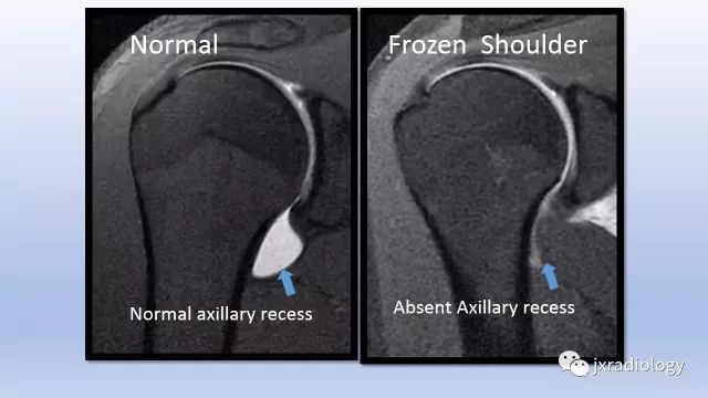 - 正常下盂肱韧带测量值<4毫米,在斜冠位上关节囊中间层面显示最好;在粘连性关节囊炎患者中,腋隐窝软组织增厚≥1.3厘米