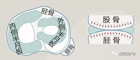 在不负重时,小腿的胫骨与大腿的股骨不接触,半月板衬垫介于两者之间。在负重时,半月板承接了约 70% 的压力,大大降低了小腿骨上端受力,防止大腿小腿骨骼的直接相互摩擦,从而很好的保护了膝关节的软骨和滑膜。如果将半月板切除,则小腿的胫骨上端的压力峰值可上升 2 倍,引起软骨退变,造成膝关节骨性关节炎。半月板横裂时,半月板的承重功能完全丧失。