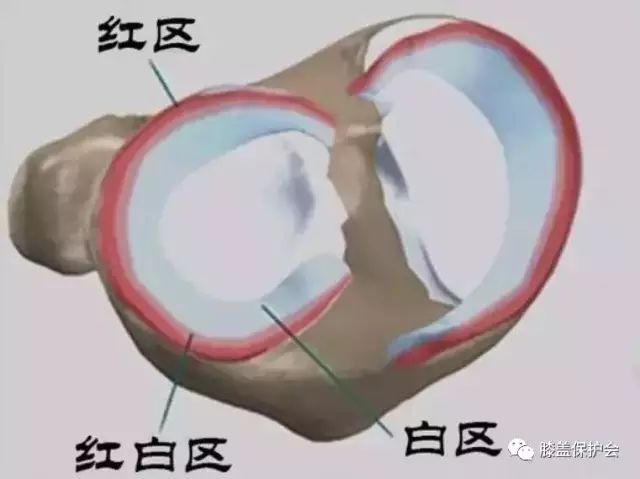 国外学者将半月板分为三个区,即红区,红白区及白区。红区有血运,撕裂后愈合能力强,红白区位于有血运和无血运的交界处,有一定愈合能力。白区无血运,损伤后极难愈合。因此,半月板损伤在红区和红白区,在妥善修复后可以愈合,但是,若半月板损伤区域在白区,一般情况下很难自我愈合。