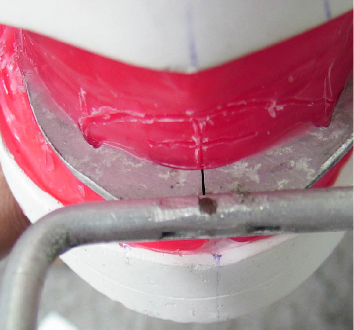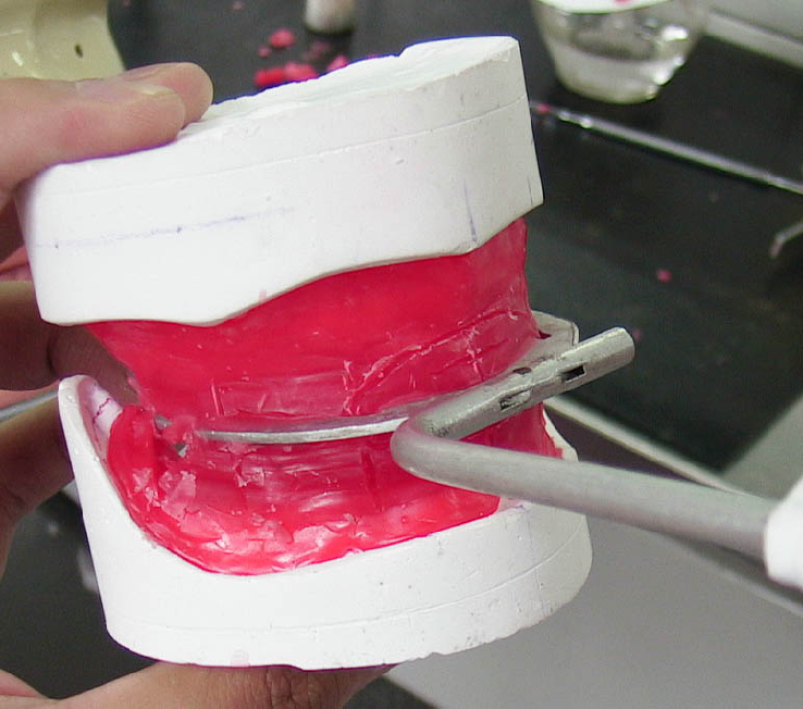 加热后插入上牙合堤、离牙合平面平面约2mm、内叉起辅助固位作用,只需插入牙合堤少许、牙合叉平面与牙合平面平行;