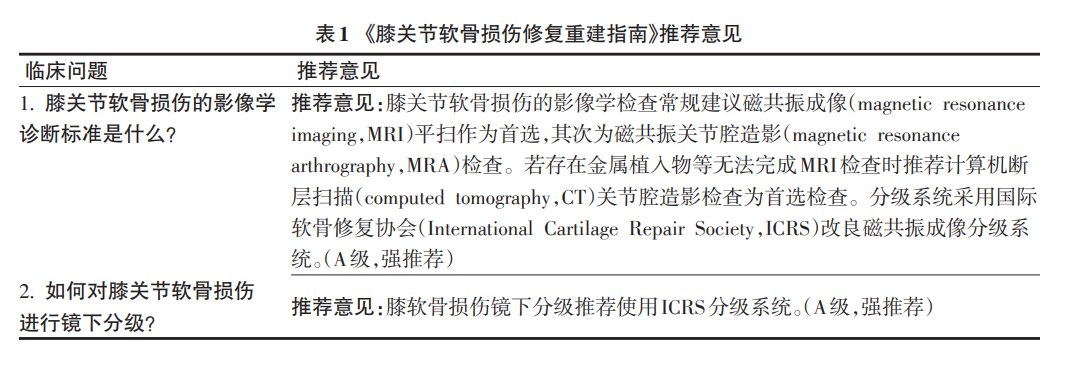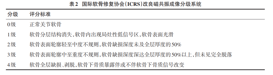 推荐意见:膝关节软骨损伤的影像学检查常规建议磁共振成像(MRI)平扫作为首选,其次为磁共振关节腔造影(MRA)检查。若存在金属植入物等无法完成MRI检查时推荐计算机断层扫描(CT)关节腔造影检查为首选检查。分级系统采用国际软骨修复协会(ICRS)改良磁共振成像分级系统。(A级,强推荐)(表1)。