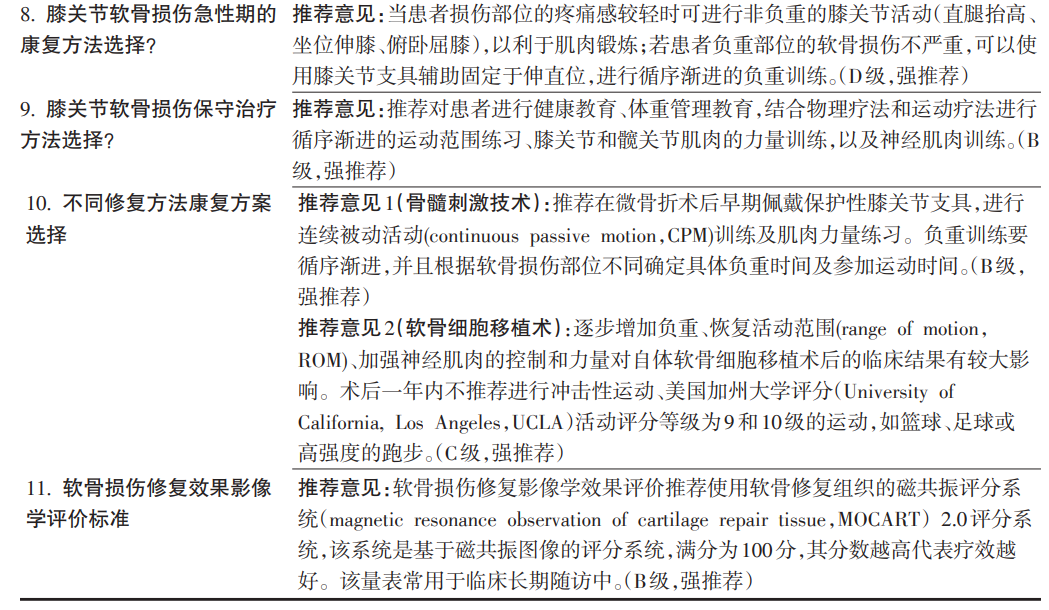 推荐意见说明:软骨损伤急性期的康复方法需要视患者损伤的部位及大小等因素制定个体化康复训练计划,一个循序渐进的康复计划(关节活动范围、肌肉耐力训练,力量训练)对于患者的恢复至关重要。并根据膝关节肌群、肌力与关节活动度的改善情况,调整训练方式及训练量。