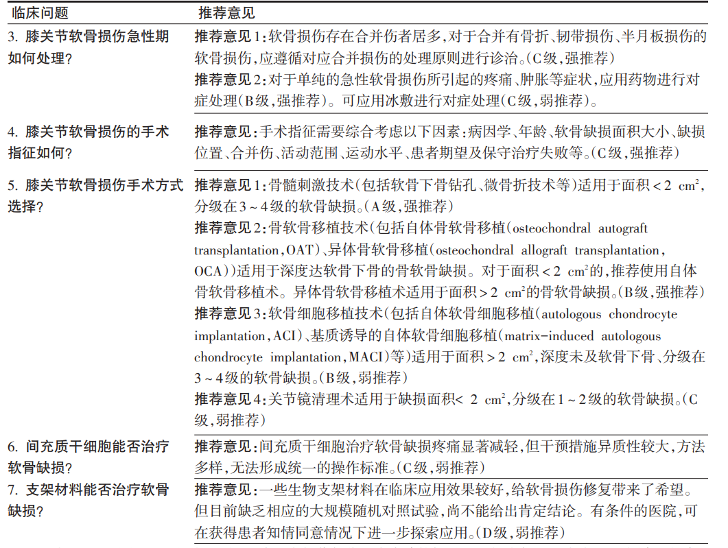 证据说明:未找到直接阐述软骨损伤手术适应症的文献,该证据主要来自于2篇共识,1篇是关于髌股关节大面积软骨和骨软骨缺损处理的专家共识[22],另外 1 篇是膝关节软骨和骨软骨缺损的支架治疗共识[23]。总体证据质量低,GRADE分级C级。