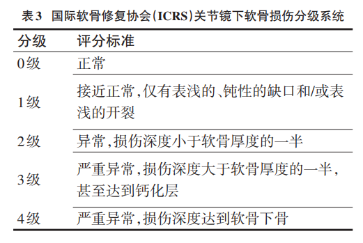 推荐意见:膝软骨损伤镜下分级推荐使用国际软骨 修 复 协 会(International Cartilage Repair Society,ICRS)分级系统。(A级,强推荐)(表2)