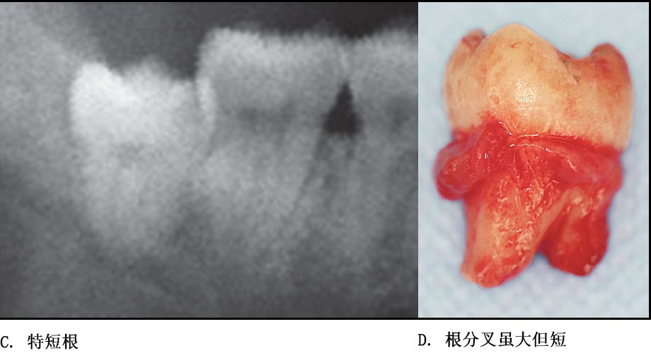 单根牙、根分叉不大者、合并根、融合根、特短根、锥形根阻力较小。若根尖区向远中弯曲、无弯曲或根尖未形成,则阻力也较小。