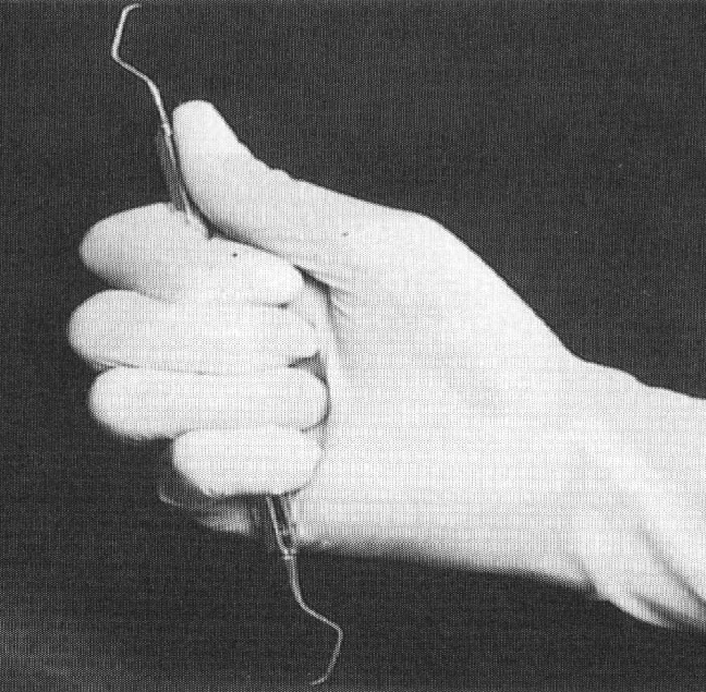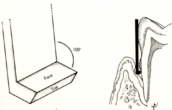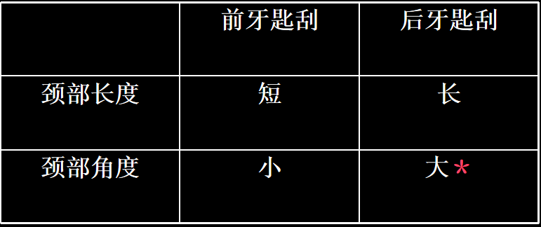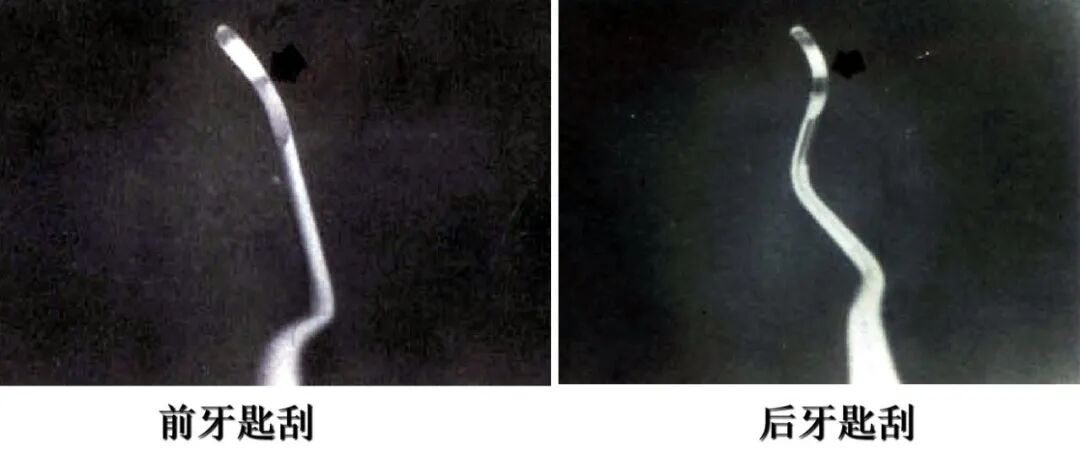 2、刃部工作端与牙面紧贴,匙刮颈部的下端与牙齿长轴平行。