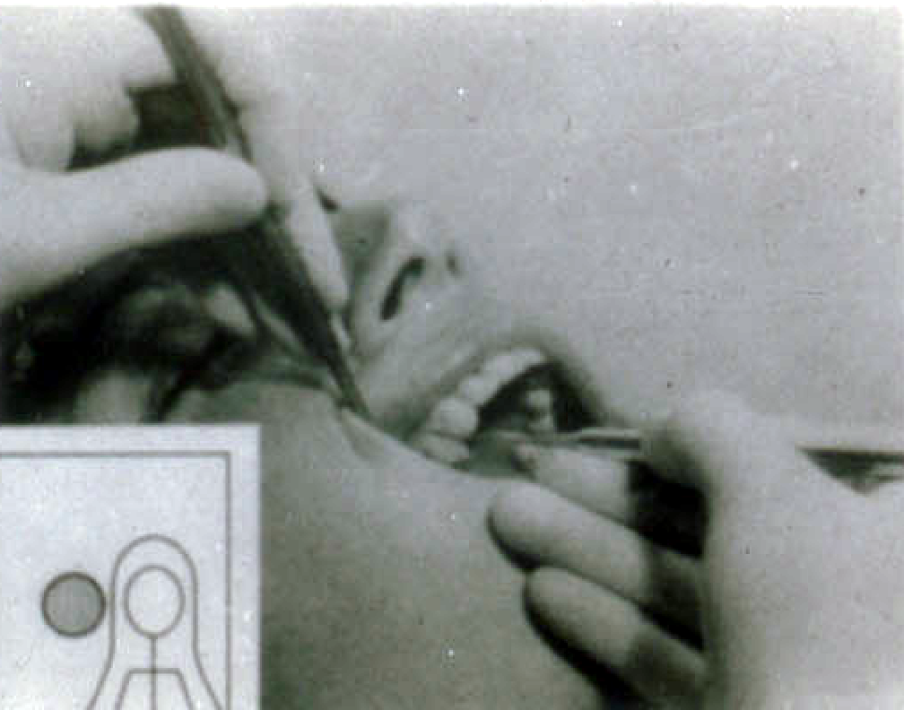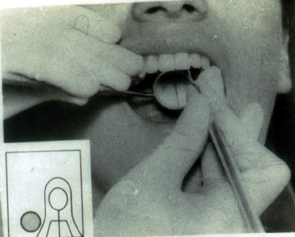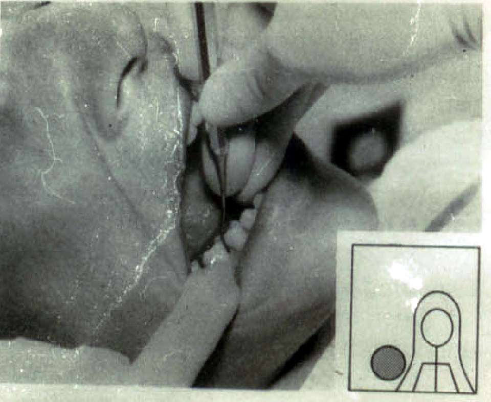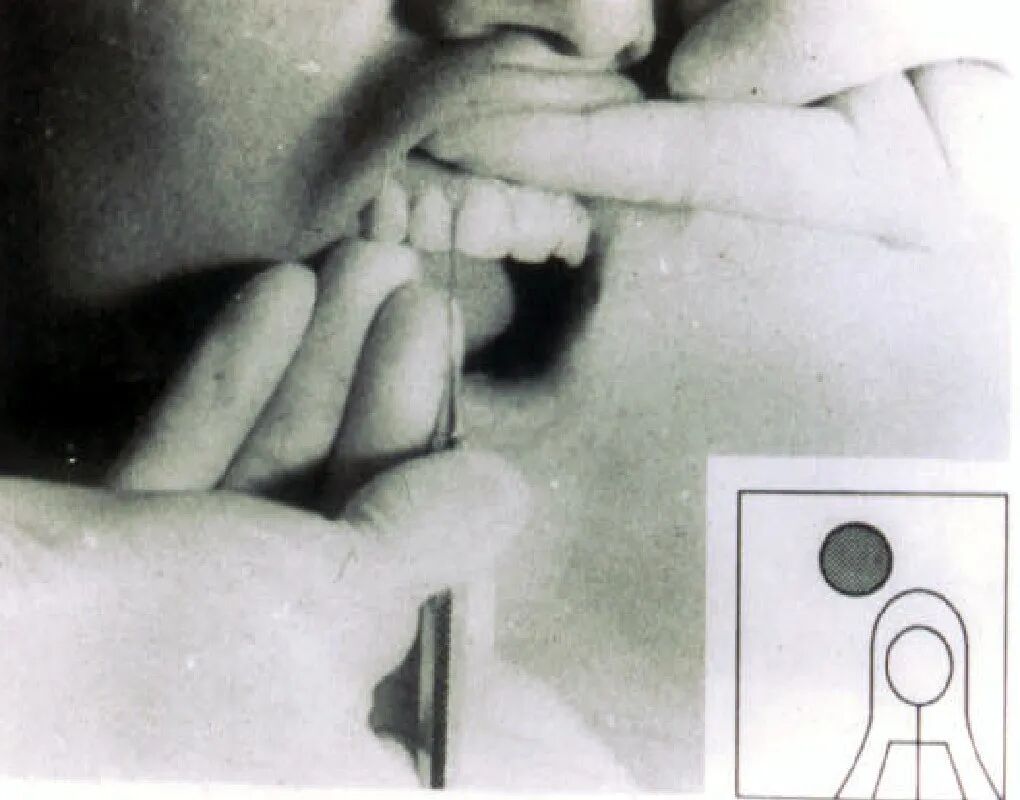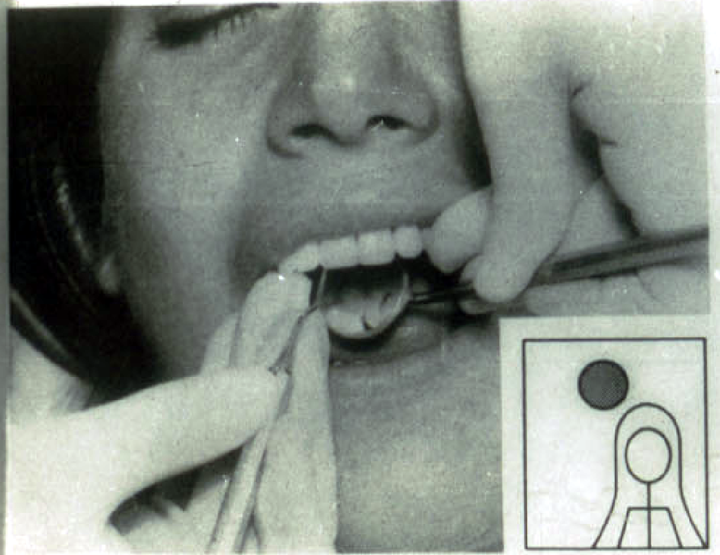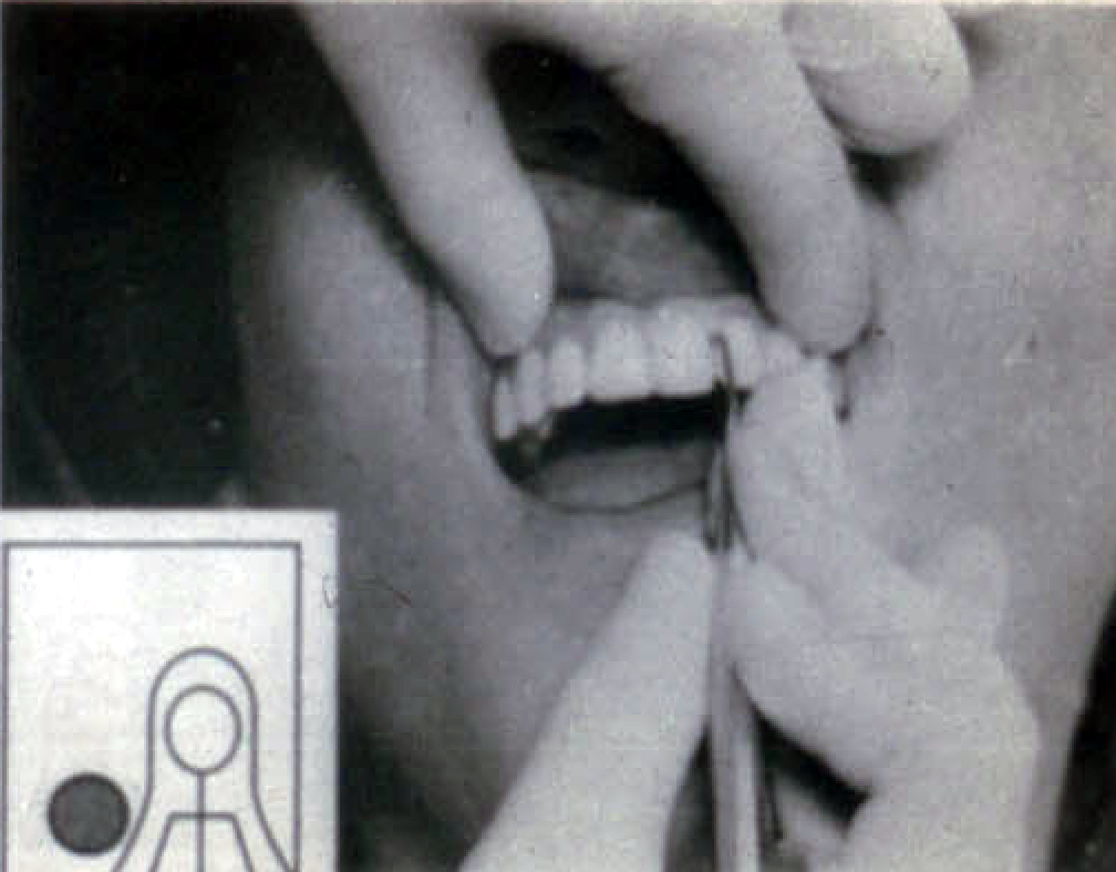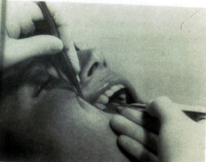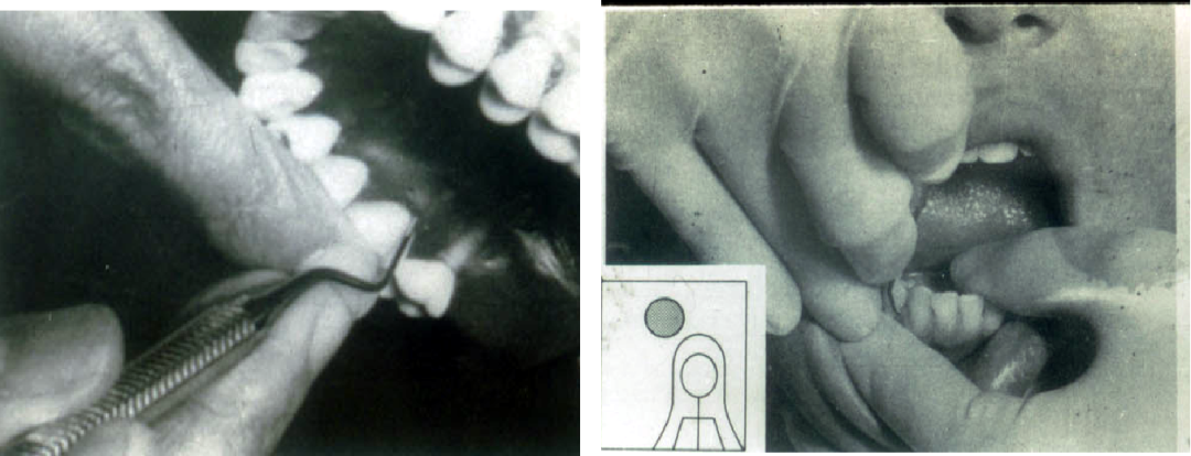 左手手指除可作附加支点外,尚可牵引唇颊部,以暴露视野。