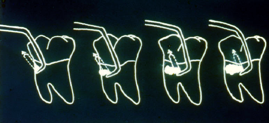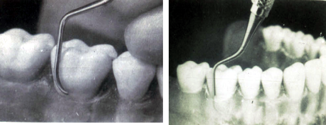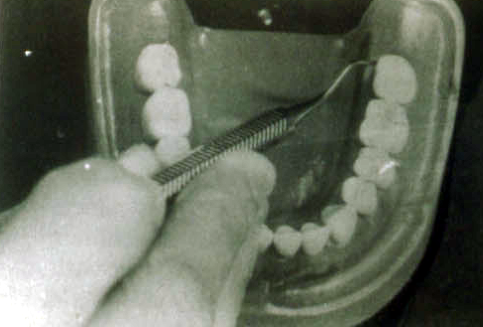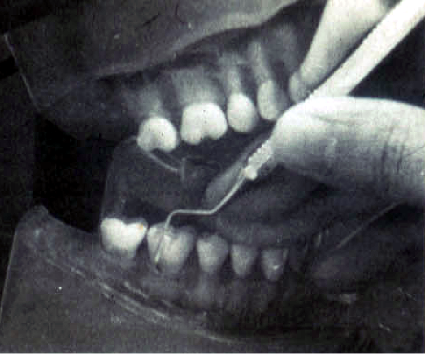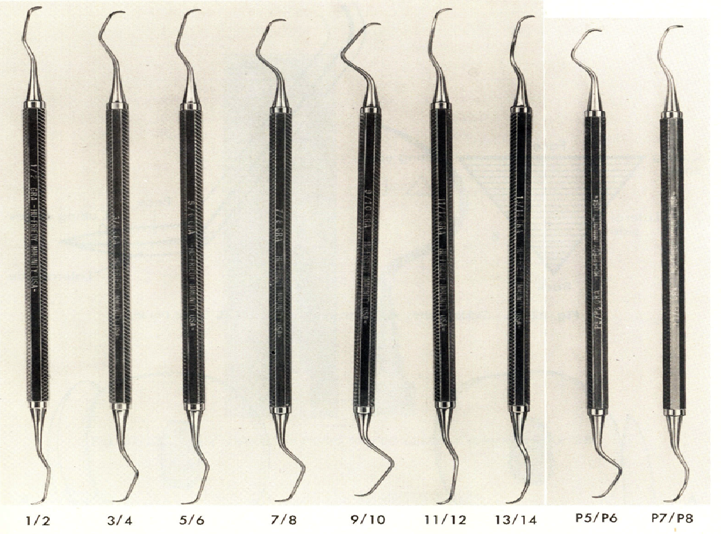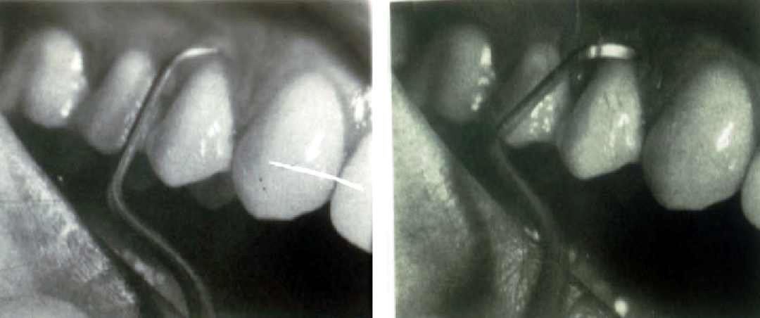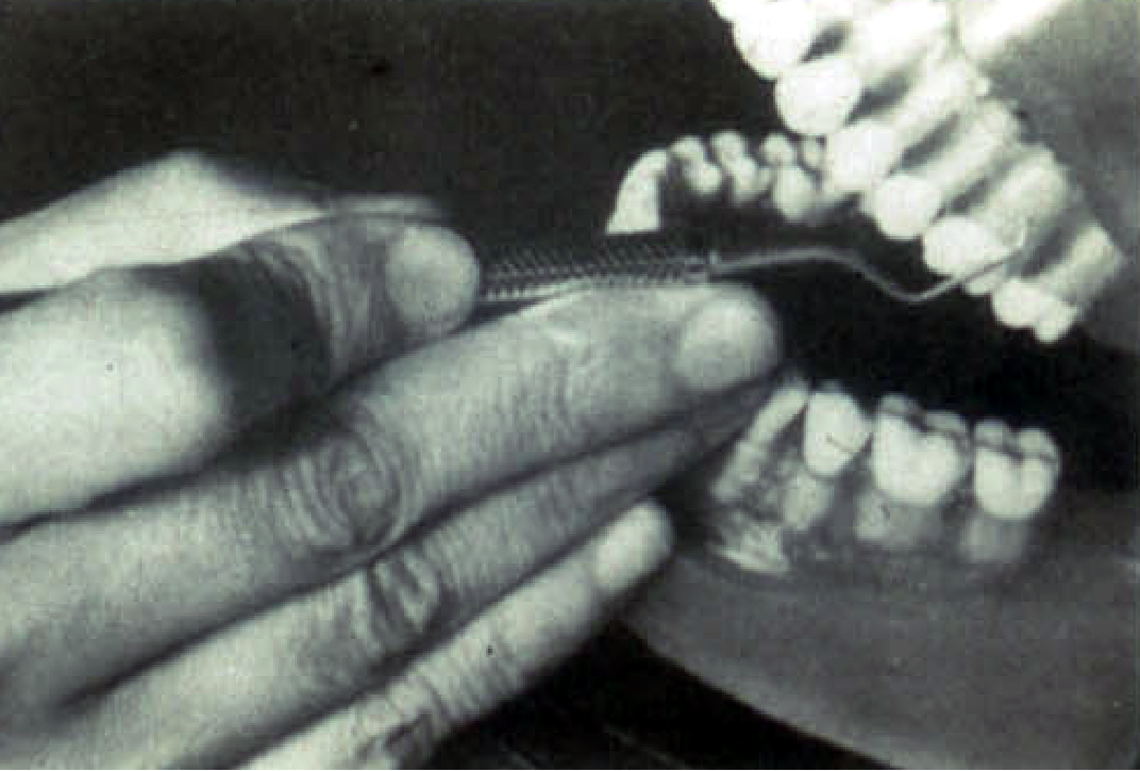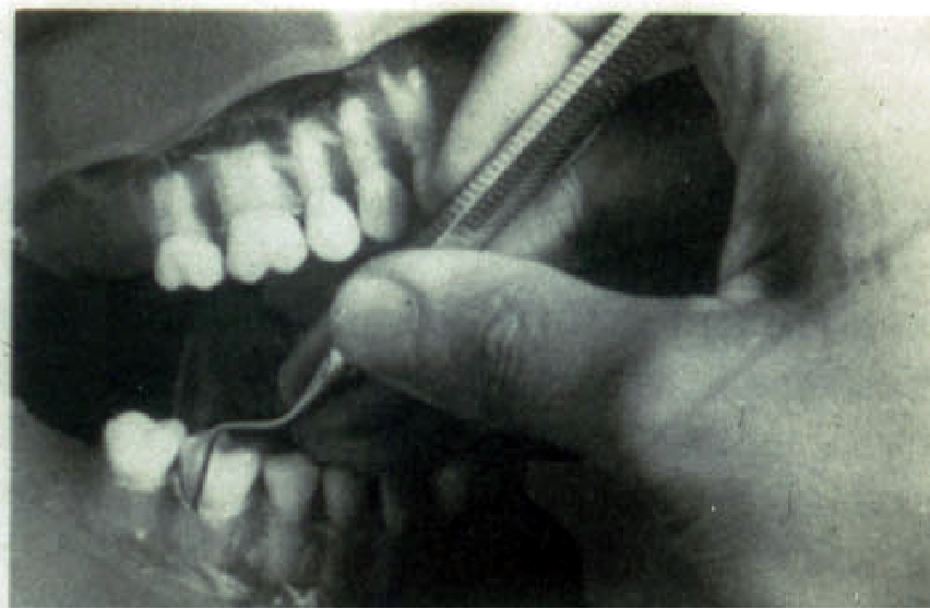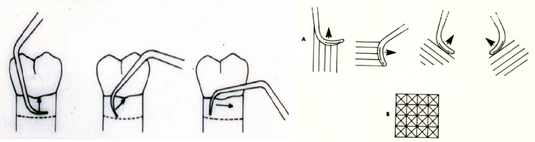 4、根面平整:作一系列长的、复迭式的、刨的动作,进行垂直向、斜向、水平向三个方向的刮治,直至根面变硬和平滑。