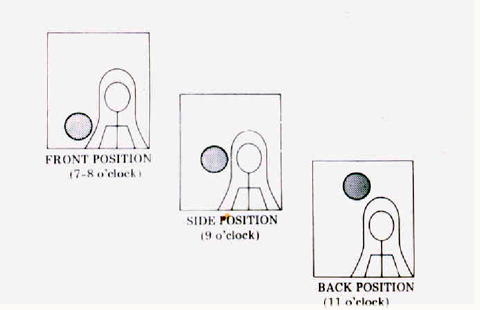术者与患者之间的位置关系有三种:前位:7-8点侧位:9点后位:11点