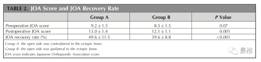上海长征医院对此进行研究,将OPLL单开门患者分为2组,A组骨化对侧开门,B组骨化侧开门。结果发现骨化对侧开门与同侧开门的大部分指标对比均无显著性差异。