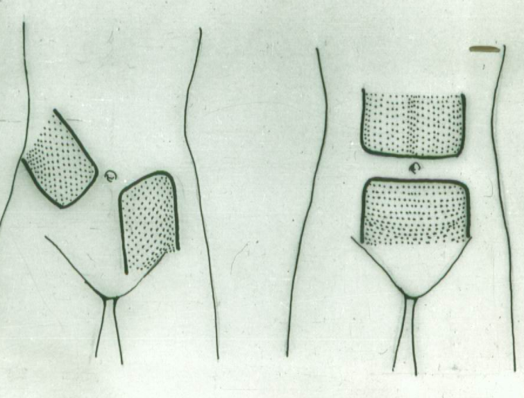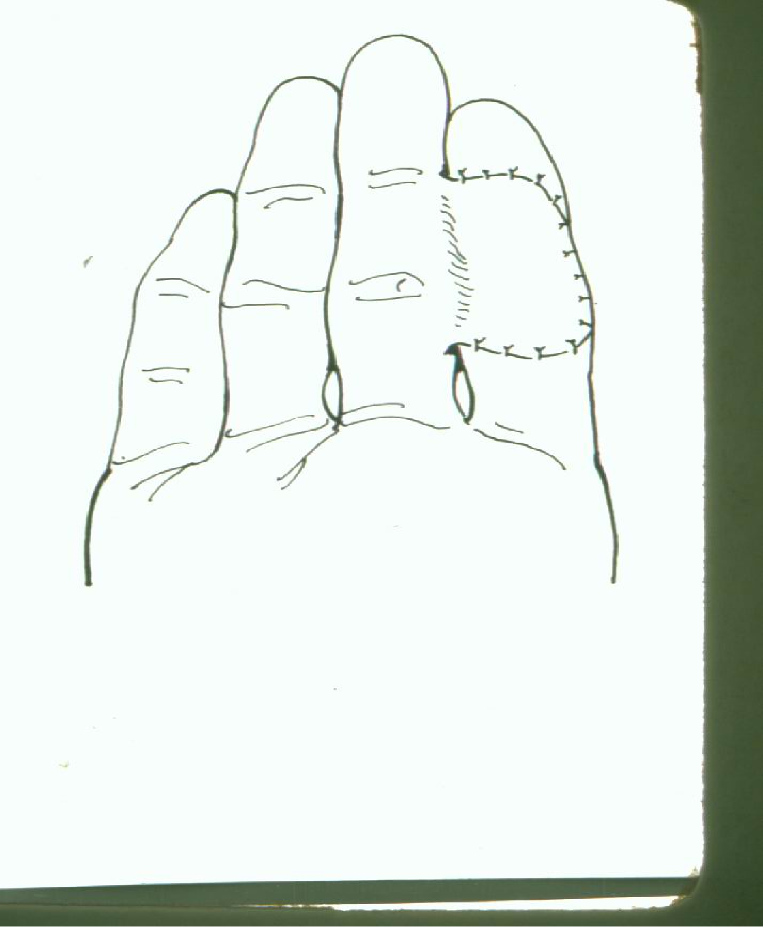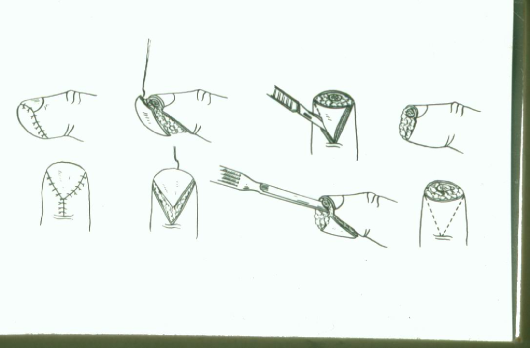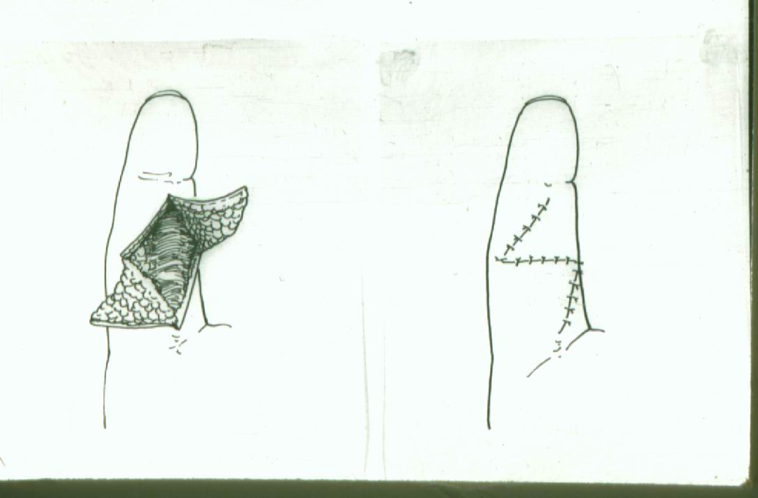 扁平皮瓣可取自:腹部、手指背、手掌、前臂、上臂等。