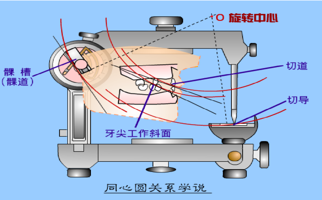 Gysi于1908年提出同心圆关系学说:认为髁道、切道和牙尖工作斜面均为同心圆上的一段截弧,称为平衡牙合的同心圆学说,并依此设计了牙合架。要求髁导、切导和牙尖工作斜面的法线能交于一点(R)。