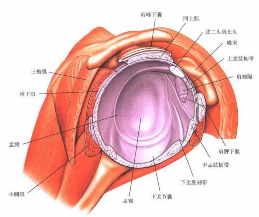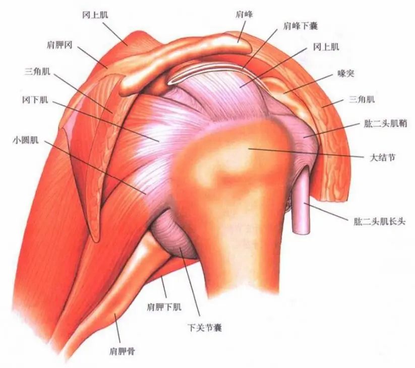 图4 肩关节的解剖。右肩关节的外侧观,三角肌的外侧部分已经去除,显示覆盖在关节上较厚的肌肉。