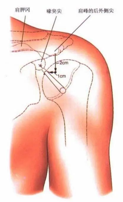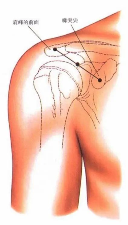 在锁骨外侧1/3前缘下2.5 cm处,用手指由外下向后上斜线扪压直到感觉到喙突。
