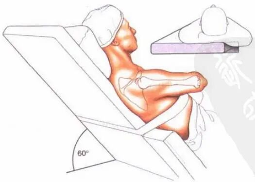 图6 肩关节镜患者的体位,使手术台的头端抬高60°,移动患者使患肩离开台缘以便器械进入肩关节的前后面,这种体位又称为“沙滩椅”体位。