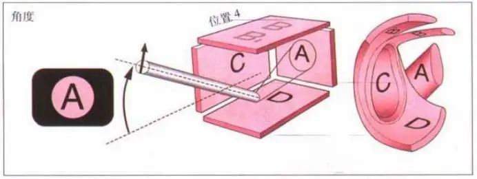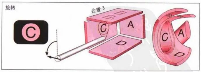 图2 旋转镜子,可以看到与其长轴呈30°角的不同视野。从位置2逆时针旋转镜子90°至位置3,视野B'就改为C。