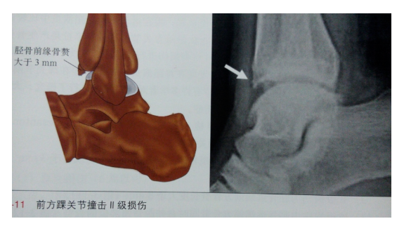 定义:胫骨远端前方或距骨颈异常增生的骨赘突入胫距关节内,在踝关节背屈时产生撞击,造成活动受限和疼痛。多见于运动员及舞蹈演员,侧位X线片是这类损伤最为常用的影像学检查方法。