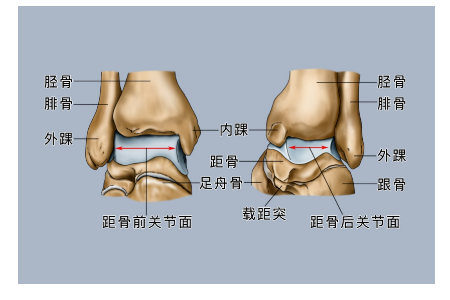 距骨滑车前宽后窄,踝关节背屈时,较宽的滑车前部进入关节凹,关节较稳定;关节跖屈较窄滑车后部进入关节凹,且可作轻微侧翻运动此时关节不稳定,易发生扭伤。