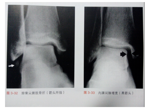 检查:伤侧踝肿胀、局部压痛、可有瘀斑