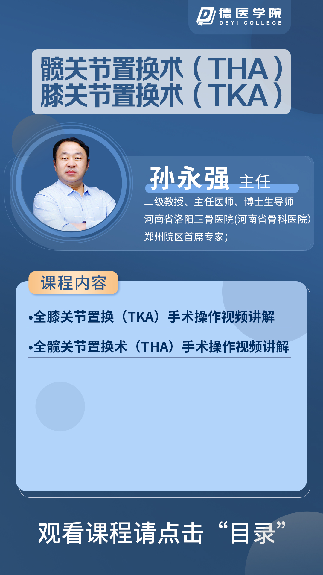 由河南省骨科医院的孙永强指导操作:全髋关节置换术(THA)手术操作视频讲解,全膝关节置换(TKA)手术操作视频讲解