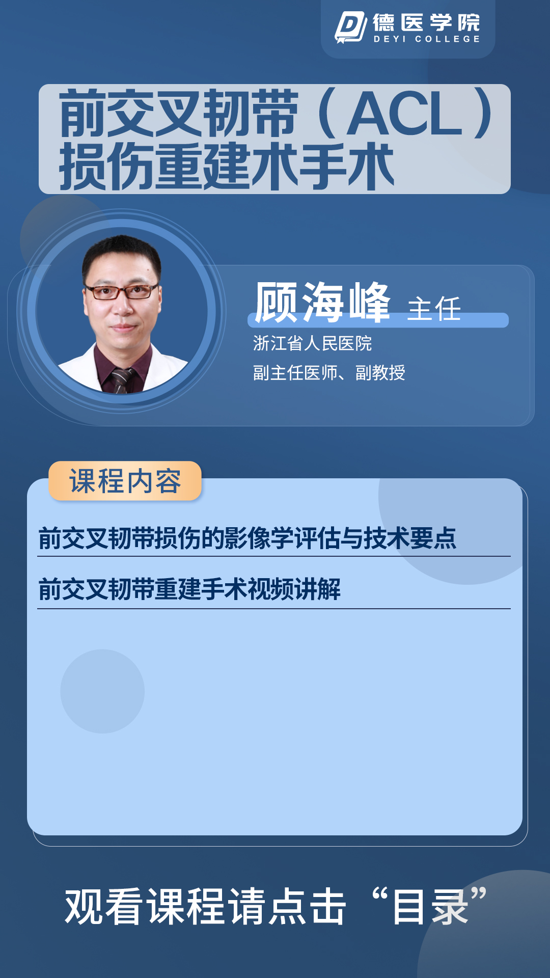 来自浙江省人民医院运动医学中心顾海峰教授授课:前交叉韧带损伤的影像学评估与技术要点、前交叉韧带重建手术视频讲解。