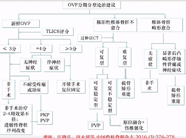 其中新鲜的骨质疏松椎体骨折(OVF)患者。在进行胸腰椎骨折严重程度评分(TLICS评分)后,≤3分的患者可选择非手术治疗,当不耐受疼痛或卧床患者时,则可选择PKP或PVP手术的治疗方法。如患者非手术治疗2—4周效果不佳时或进展性脊柱序列改变时,也可行PKP或PVP手术治疗。